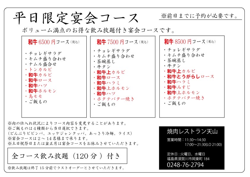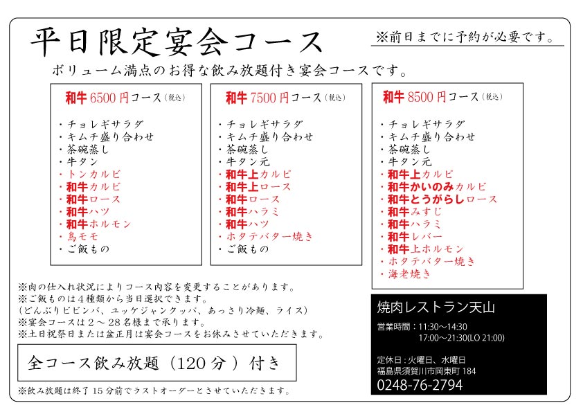 ボリューム満点の お得な飲み放題付き 平日限定宴会コースです。